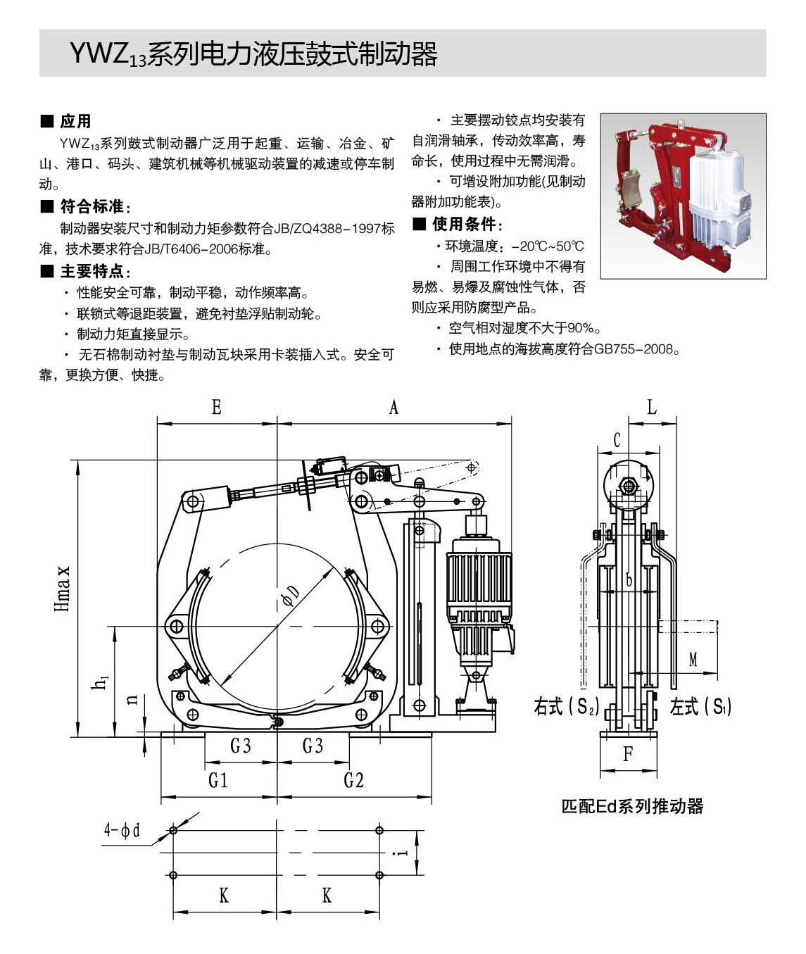 YW,YWZ13系列電力液壓鼓式制動(dòng)器,廣泛應(yīng)用于有防爆要求的各種起重運(yùn)輸、皮帶運(yùn)輸、港口裝卸、冶金及建筑機(jī)械中各種機(jī)構(gòu)的減速和停車(維持)制動(dòng)。
